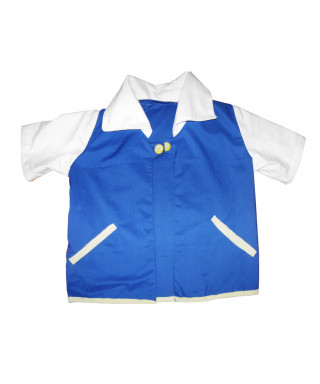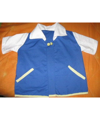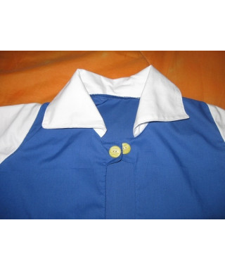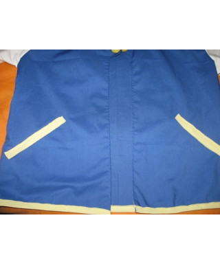 La giacca è realizzata interamente in cotone azzurro con manica e colletto bianchi ed inserti gialli. Abbellita con due bottoncini gialli.