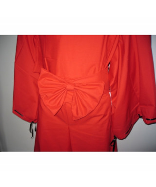 L'abito è composto da kimono e pantaloni rossi ed è impreziosito dalla collana e dalle orecchie fissate su un frontino trasparente.