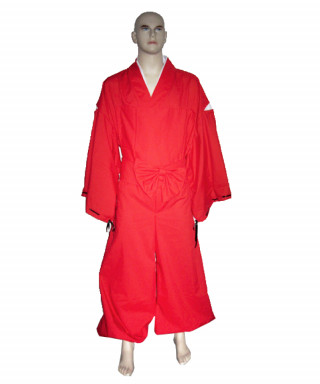 L'abito è composto da kimono e pantaloni rossi ed è impreziosito dalla collana e dalle orecchie fissate su un frontino trasparente.